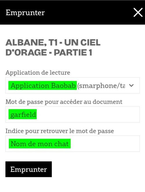 - Choisir un mot de passe et un indice pour trouver le mot de passe, il vous sera demandé à la première lecture du livre sur Baobab puis cliquez sur Emprunter